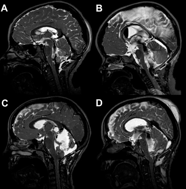 Figura 2: Imágenes de RM sagitales ponderadas en T2 drive, de cuatro postoperatorios de resección tumoral de fosa posterior. En A y B se evidencia vacío de flujo entre IV ventrículo y cisterna magna. En C y D se observa la ausencia de comunicación de LCR (permeabilidad) entre IV ventrículo y cisterna magna.