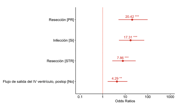 Figura 4: Odds ratios ajustados para las variables grado de resección, infección y flujo de salida del IV ventrículo (postop.), en orden de importancia.