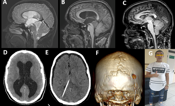 A) Corte sagital de RMI preoperatoria potenciada en T2. Se observa la lesión hiperintensa en región pineal. B) Corte sagital de RMI preoperatoria potenciada en t1 con Gadolinio. Obsérvese la ausencia de captación de contraste y la presencia de la vena de Galeno por encima de la lesión. C) Corte sagital de RMI enT1 postoperatoria donde se aprecia la resección total de la lesión. D) TC axial postoperatoria observándose la hidrocefalia obstructiva a pesar de la tercer ventriculostomía endoscópica. E) TC axial donde se observa la colocación del catéter ventricular y la resolución de la hidrocefalia. F) Reconstrucción tridimensional de la TC postoperatoria donde se observa el área de la craneotomía. G) Fotografía postoperatoria del paciente.