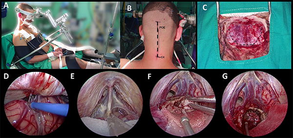 Capturas transoperatorias. A) Posición de semisentado. B) Se observa la marca de la incisión quirúrgica desde 2 cm encima del inion hasta la apófisis espinosa de C4. C) Se observa la extensión de la craniectomía de fosa posterior y la marca de la durotomía (línea discontinua negra). D) Durante la identificación y cauterización de las venas puente. E) Durante la disección microquirúrgica de la aracnoides sobre la vena vermiana superior. F) Durante el debulking intratumoral. G) Luego de la resección tumoral total. Se observa el lecho quirúrgico.