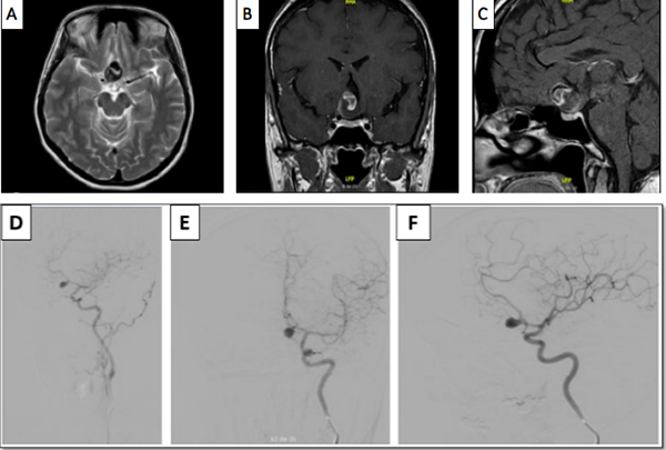 . RMN de cráneo en la que se identifica lesión sacular de localización supraselar con efecto de masa, mide 22 mm x 19 mm x 17 mm (A), desplaza y comprime el quiasma óptico y la porción cisternal de ambos nervios ópticos, especialmente el del lado derecho (B), tiene un área en forma de media luna que realza tras la administración del medio de contraste (B y C). En la parte inferior se observa la Arteriografía cerebral con un aneurisma sacular de contornos irregulares, localizado en el segmento comunicante anterior de 8mm x 6mm x 5 mm (D, E y F).