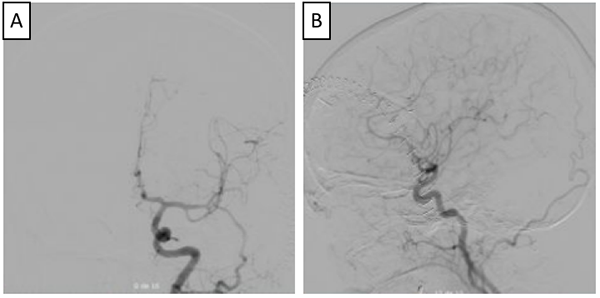 . Arteriografía de control postoperatoria (A y B), en la que se observa adecuada exclusión de aneurisma cerebral