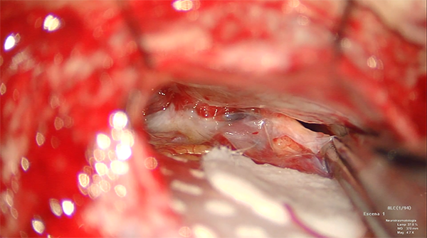 Es importante, como se puntualiza en el video, que el abordaje sea lo mas amplio posible, exponiendo la emergencia de los pares bajos, con apertura de la cisterna magna para obtener una porgresiva relajacion del cerebelo, a fin de disecar extensivamente las adherencias de las estructuras neurovasculares del ángulo pontocerebeloso, lo cual redundara en disponer de múltiples ángulos de ataque una vez expuesta la malformación.