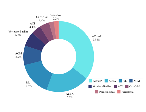 Se evaluaron las diferentes localizaciones de los aneurismas, la más frecuente fue el segmento comunicante posterior (AComP) con un 35.6% (n = 16); arteria comunicante anterior (ACoA) 20% (n = 9); sin localizar (S/L) por falta de estudio etiológico con un 15% (n = 7); de ACM 8.9% (n = 4); vertebrobasilar 6.7% (n = 3); arteria carótida interna (ACI) 4.4% (n = 2); carótido-oftálmico (Car-Oftal) 4.4% (n = 2); paraclinoideo 2.2% (n = 1) y pericalloso 2.2% (n = 1) (Tabla 3, Figura 2).