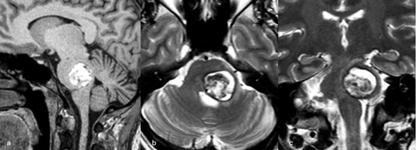 Figura 3. RM preoperatoria de encéfalo. Se evidencia una lesión única intraaxial centrada en puente y pedúnculo cerebeloso derecho, sugerente de un cavernoma roto. A, B y C) Imágenes ponderadas en T2 en cortes sagital, axial y coronal, respectivamente, donde se observa un importante hiperintensidad perilesional, sugerente de edema.