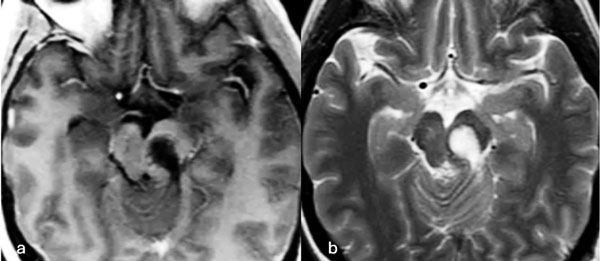 Figura 2. RM postquirúrgica de encéfalo. Se evidencia una exéresis completa, sin lesión de estructuras adyacentes. A) Imagen ponderada en T1 posterior a la administración de gadolinio, corte axial. B) Imagen ponderada en T2, corte axial.