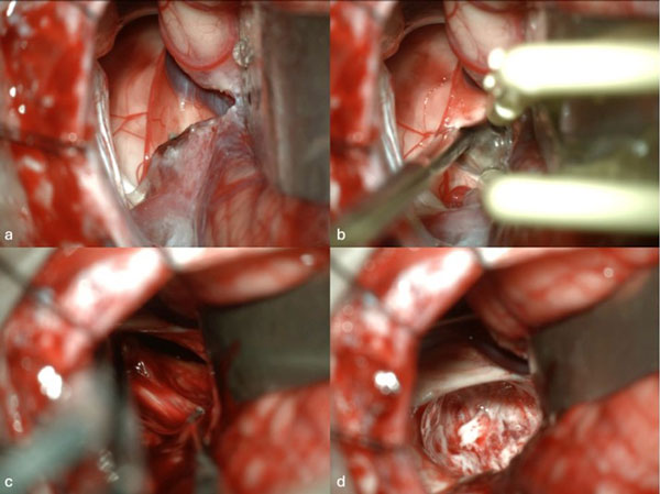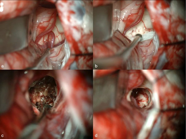 Figura 1. Imágenes intraoperatorias bajo microscopía. Craneotomía suboccipital lateral. Se ingresa al mesencéfalo desde posterior por una ruta supracerebelosa infratentorial lateral. A y B) Corticotomía en surco mesencéfalo lateral. C) Identificación y resección en bloque de la malformación cavernomatosa. D) Revisión del lecho, sin remanente.