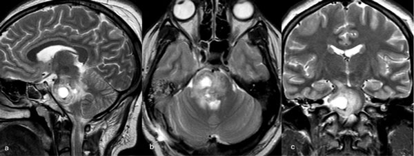 Figura 3. RM preoperatoria de encéfalo. Se evidencia una lesión única intraaxial centrada en puente y pedúnculo cerebeloso derecho, sugerente de un cavernoma roto. A, B y C) Imágenes ponderadas en T2 en cortes sagital, axial y coronal, respectivamente, donde se observa un importante hiperintensidad perilesional, sugerente de edema.