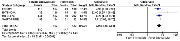 El manejo con terapia endovascular presenta un aumento de la tasa de revascularización del vaso ocluido en comparación a control (OR 6,16, IC del 95%: 4,39-8,64 p= <0,0001) (X2 = 3,47 df = 3 I2= 14% p= 0,32) (graf. 5).