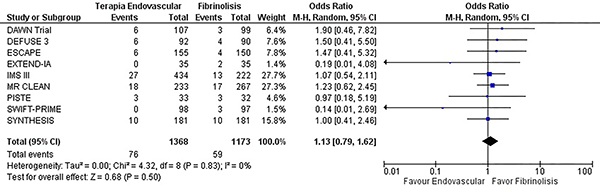 En el contexto de desenlaces clínico favorables se encontró un incremento de la independencia funcional a 90 días de los pacientes tratados con terapia endovascular en comparación con la fibrinólisis (OR 1,78, IC del 95%: 1,52 – 2,08 p= <0,0001) (X2 = 37,31 df = 9 I2= 76% p=<0,0001) con estudios heterogéneos para este desenlace (graf. 6). No hubo diferencia significativa en la aparición de isquemias recurrentes (OR 0,86, IC del 95%: 0,51 – 1,47 p= 0,59) (X2 = 2,13 df = 4 I2= 0% p=0,71) (graf.7). La terapia endovascular no fue superior al manejo médico en la aparición de hemorragia intracerebral, sin significancia estadística (OR 1,13, IC del 95%: 0,79 – 1,62 p= 0,5) (X2 = 4,32 df = 8 I2= 0% p= 0,83) con una distribución homogénea de los datos en los estudios incluidos para la evaluación de este desenlace (graf. 8 y tabla 1).