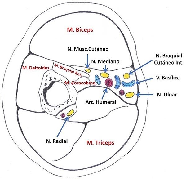 Tal vez una de las visiones de la anatomía topográfica más útiles para esta técnica quirúrgica, sea la descripción de un corte axial a nivel del eje de la anastomosis nerviosa. Podemos dividir el brazo en su porción media en dos grandes compartimientos: anterior y posterior, separados por un tabique intermuscular interno y otro externo, que se extienden desde el húmero hasta la cara profunda de la aponeurosis braquial. A nivel del abordaje encontramos por planos desde superficial a profundo: la piel, el tejido celular subcutáneo y la fascia o aponeurosis braquial. Luego se debe ingresar al compartimiento anterior inmediatamente por delante del tabique intermuscular interno, por lo que toda la cirugía se desarrolla en dicho compartimiento. El nervio ulnar en la parte media del brazo atravieza el tabique intermuscular interno y se situa en el compartimiento posterior, no obstante, a la altura de la cirugia el nervio se situa integramente en el compartimiento anterior, por lo cual podremos identificarlo en situación inmediata a dicho tabique interno, generalmente acompañado por la arteria colateral interna, rama de la humeral. Guiados por el latido, puede identificarse la arteria humeral, que se encontrará acompañada de sus dos venas satélites, humerales interna y externa; asimismo su trayecto vascular se encontrará acompañado en todo el brazo por el nervio mediano. El nervio musculocutáneo discurre, luego de emerger de su traspaso por músculo coracobraquial, en un espacio con tejido conectivo laxo entre los músculos biceps y braquial anterior.Asimismo, no podemos dejar de mencionar a dos elementos superficiales e internos que debemos diferenciar del resto de las estructuras previamente enumeradas: la vena basílica y el nervio braquial cutáneo interno. La vena se situará anterior al nervio ulnar y posterior al braquial cutáneo interno, mientras que este último podemos observarlo de escaso calibre y sin respuesta a la neuroestimulación, ya que se trata de un nervio sensitivo puro (figs. 1 y 2).