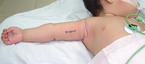 Figura 3: Posición del paciente y marcación de incisión (Brazo derecho).